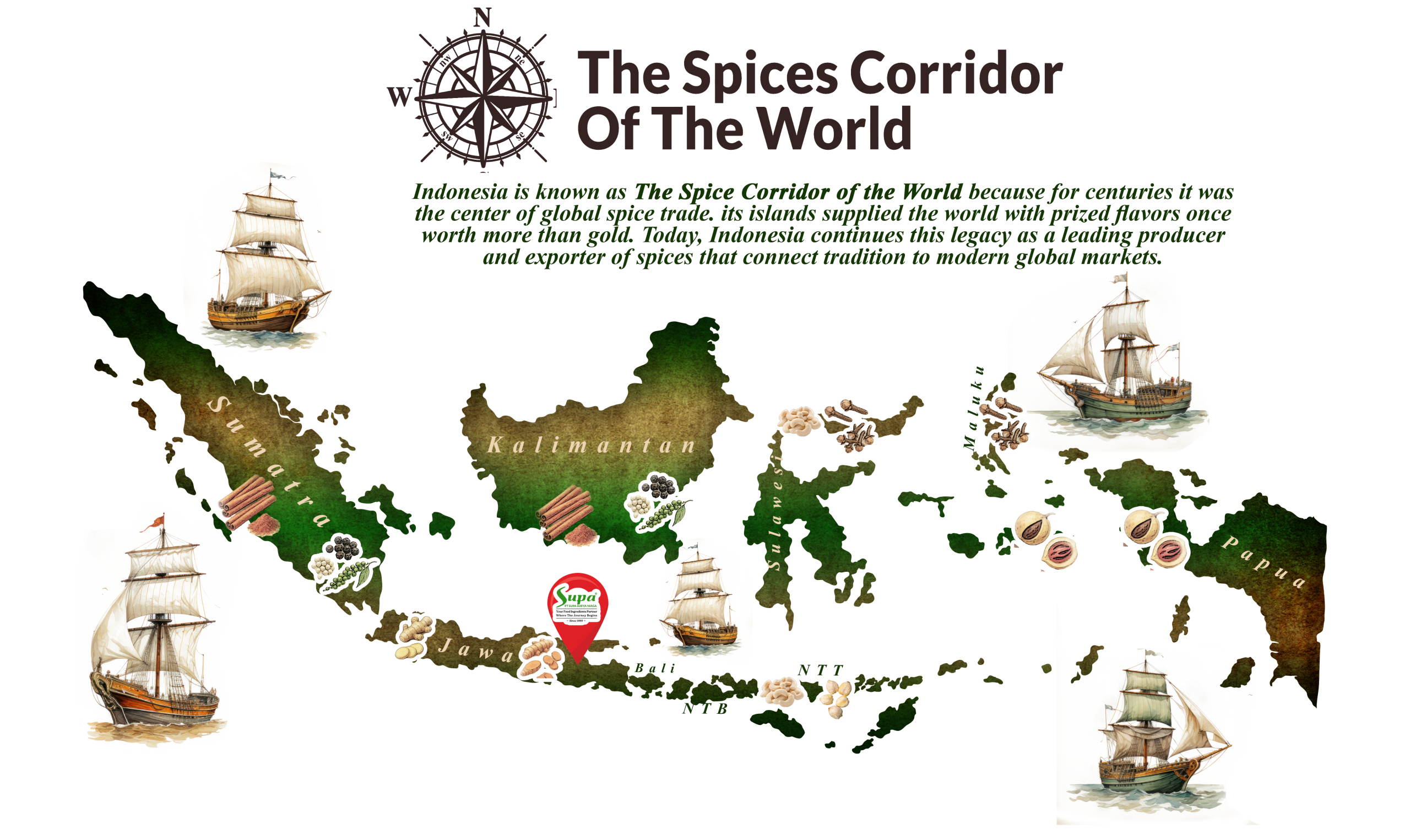PT. Supa Surya Niaga is a trusted spices and cashew nuts manufacturer in Indonesia, established in 1999. With more than 25 years of experience, we specialize in the trading, cleaning, drying, processing, and packing of high-quality spices and edible nuts for both domestic and international markets. Our long-standing expertise, strong sourcing network, and modern processing facilities make Supa a reliable partner for food manufacturers, ingredient companies, and global buyers.