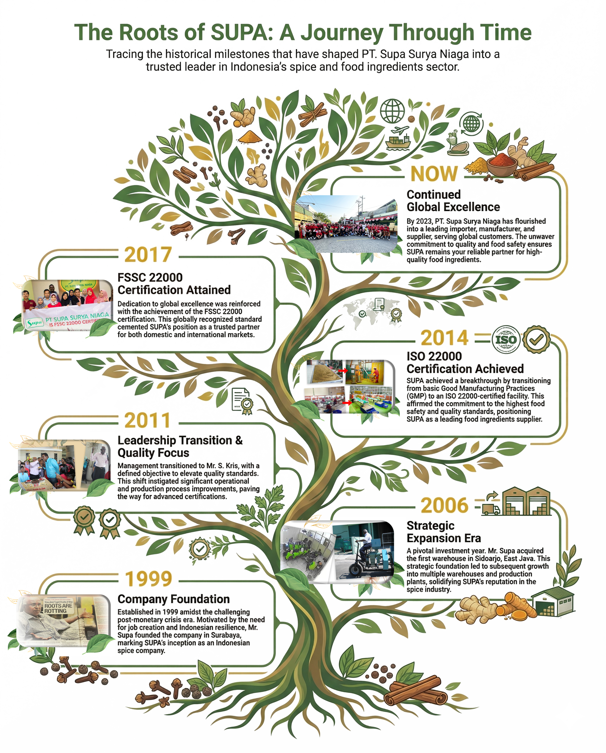 PT Supa Surya Niaga was founded on a simple yet powerful vision: to deliver high-quality spices and nuts with authenticity, consistency, and trust. Our roots trace back to the passion and dedication of Pak Supa, whose deep understanding of local ingredients and commitment to quality laid the foundation of our company.